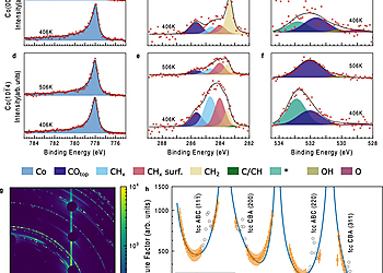 Surface state of Co(0001) sample at indicated temperatures in an atmosphere of CO:H2 1:2 at 1 bar studied by hard X-ray photoelectron spectroscopy (HAXPES) utilizing 4600 eV photons at 0.3° incidence. a shows Co 2p3/2 core-level spectra b displays the C 1 s region and c depicts the O 1 s region. Subplots d, e, f show the same conditions as a, b, c but for a Co(101¯4) surface. The columns of XPS data have constant scaling of the vertical axis. Subplot g shows a representative figure of the high energy surface X-ray diffraction HESXRD data at 67.4 keV of the Co(0001) crystal (full set is shown in SI). The detector is protected by beam stops at the bulk Bragg peak positions. h X-ray structure factor extracted from the 2D diffraction data shown in g at reaction conditions at 496 K and 1 bar reaction mixture (1:2 CO:H2), data from the hcp part of the surface used for the fit (orange circles with vertical lines indicating an estimation 10% relative error), data from the fcc part (grey circles), fit result (solid line).