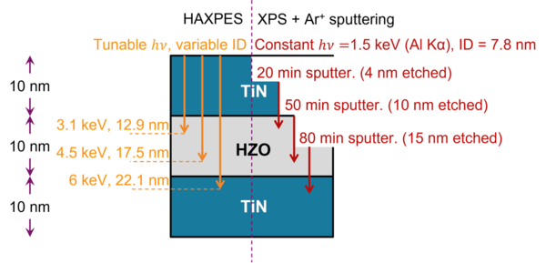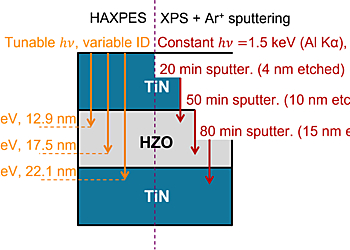 However, the performance and reliability of HZO-based devices are highly sensitive to the concentration and distribution of oxygen vacancies (VO), which influence phase stability, leakage currents, and endurance. Modest concentrations of VO optimize the orthorhombic phase but higher concentrations favor the non-polar tetragonal phase and lower concentrations the non-polar monoclinic ground state. This study presents a rigorous comparison between conventional X-ray Photoelectron Spectroscopy (XPS) and Hard X-ray Photoemission Spectroscopy (HAXPES) for quantifying VO in ultra-thin ferroelectric capacitors. The authors demonstrate that Ar⁺ ion sputtering used in XPS depth profiling introduces significant artifacts, leading to overestimation of VO concentrations by up to an order of magnitude. In contrast, HAXPES provides accurate, non-destructive measurements, revealing realistic VO levels around 1%.