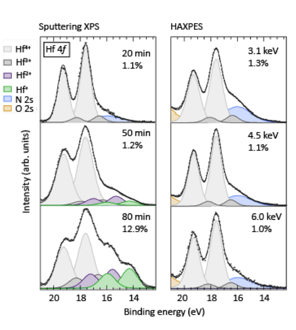 Side-by-side comparison of Hf 4f core-level spectra obtained via conventional XPS with time of Ar⁺ sputtering (left) and non-destructive HAXPES with variable photon energy (right) on TiN/HZO/TiN ferroelectric capacitors. The figure reveals how in XPS sputtering-induced artifacts, in particular preferential sputtering of oxygen, can dramatically inflate the apparent oxygen vacancy concentration— to up to 13% —compared to the realistic ~1% values measured by HAXPES. This result underscores the importance of using HAXPES for accurate defect profiling in ultra-thin ferroelectric films.