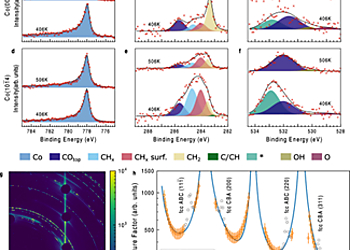 Surface state of Co(0001) sample at indicated temperatures in an atmosphere of CO:H2 1:2 at 1 bar studied by hard X-ray photoelectron spectroscopy (HAXPES) utilizing 4600 eV photons at 0.3° incidence. a shows Co 2p3/2 core-level spectra b displays the C 1 s region and c depicts the O 1 s region. Subplots d, e, f show the same conditions as a, b, c but for a Co(101¯4) surface. The columns of XPS data have constant scaling of the vertical axis. Subplot g shows a representative figure of the high energy surface X-ray diffraction HESXRD data at 67.4 keV of the Co(0001) crystal (full set is shown in SI). The detector is protected by beam stops at the bulk Bragg peak positions. h X-ray structure factor extracted from the 2D diffraction data shown in g at reaction conditions at 496 K and 1 bar reaction mixture (1:2 CO:H2), data from the hcp part of the surface used for the fit (orange circles with vertical lines indicating an estimation 10% relative error), data from the fcc part (grey circles), fit result (solid line).