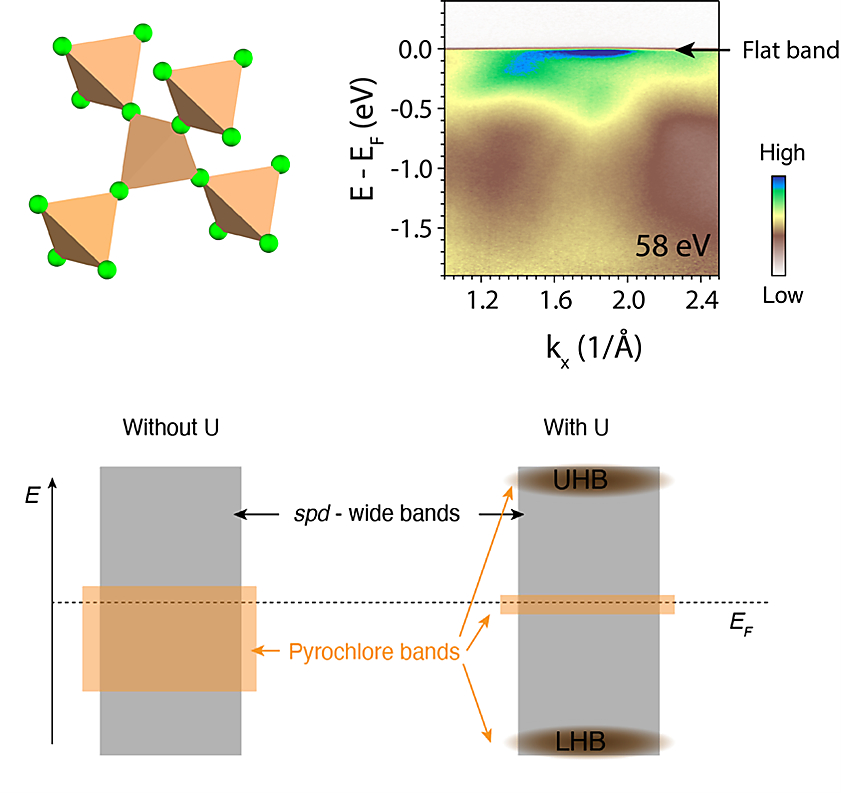 TElectronic correlation effects are manifested in quantum materials when either the on-site Coulomb repulsion is large or the electron kinetic energy is small. The former is the dominant effect in cuprate superconductors and heavy-fermion systems whereas it is the latter in twisted bilayer graphene and geometrically frustrated metals. However, the simultaneous cooperation of both effects in the same quantum material remains rare. The design aim is to produce correlated topological flat bands pinned at the Fermi level. Here, theyobserve a flat band at the Fermi level in a 3d pyrochlore metal CuV2S4. Our angle-resolved photoemission spectroscopy data reveal that destructive quantum interference associated with the V pyrochlore sublattice and further renormalization to the Fermi level by electron interactions induce this flat band. Consequently, we discover transport signatures that evidence a deviation from Fermi liquid behaviour as well as an enhanced Sommerfeld coefficient. Our work illustrates the combined cooperation of local Coulomb interactions and geometric frustration in a pyrochlore lattice system to induce correlated topology by constructing and pinning correlated flat bands near the Fermi level.